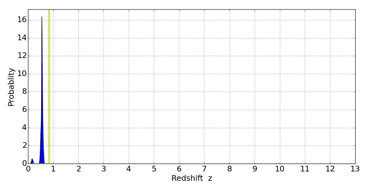 In P(z) plots: Yellow lines mark the cluster redshift z = 0.833,