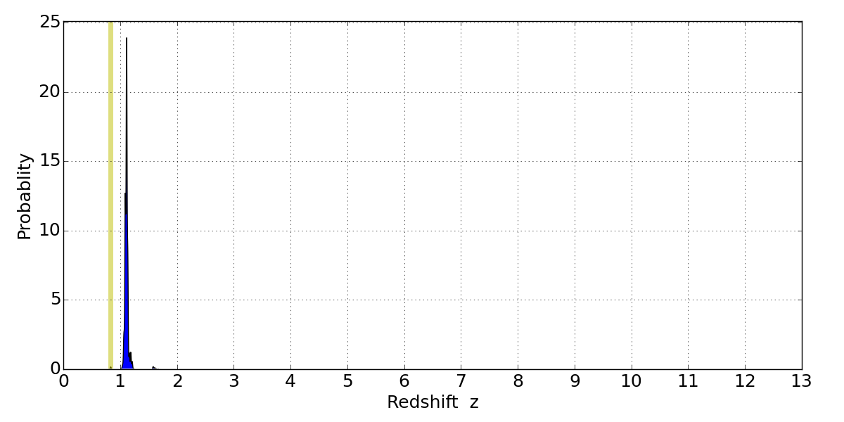 In P(z) plots: Yellow lines mark the cluster redshift z = 0.833,