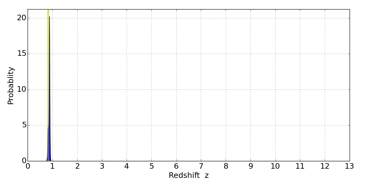 In P(z) plots: Yellow lines mark the cluster redshift z = 0.833,