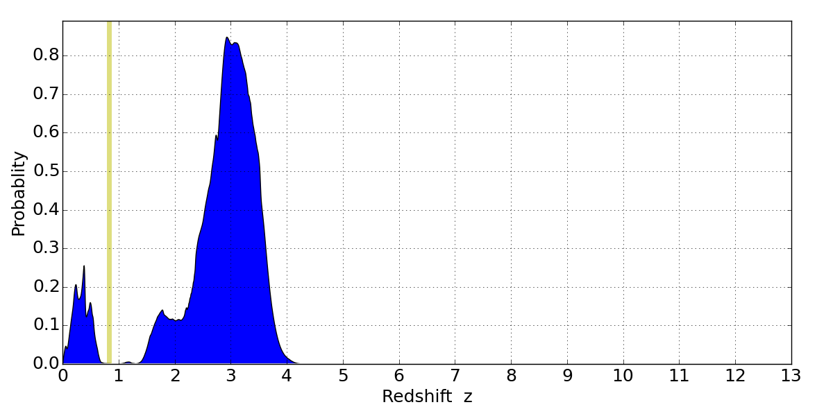 In P(z) plots: Yellow lines mark the cluster redshift z = 0.833,