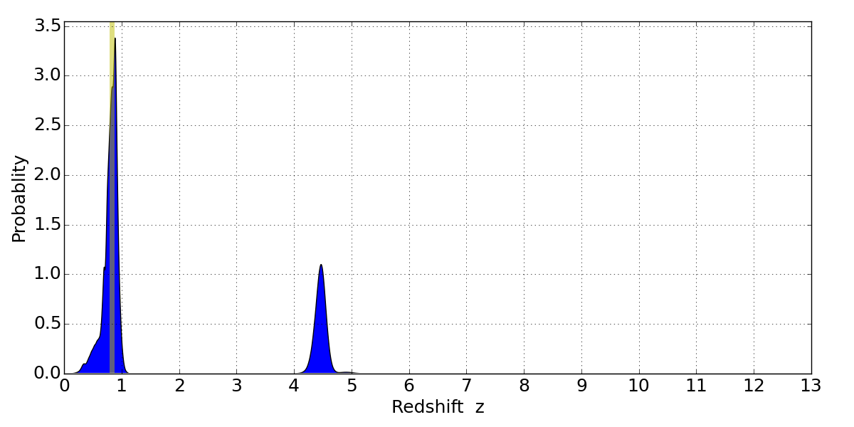 In P(z) plots: Yellow lines mark the cluster redshift z = 0.833,