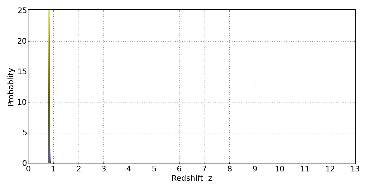 In P(z) plots: Yellow lines mark the cluster redshift z = 0.833,