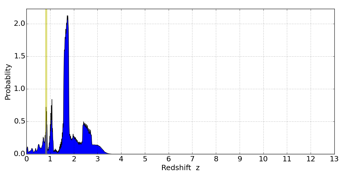 In P(z) plots: Yellow lines mark the cluster redshift z = 0.833,