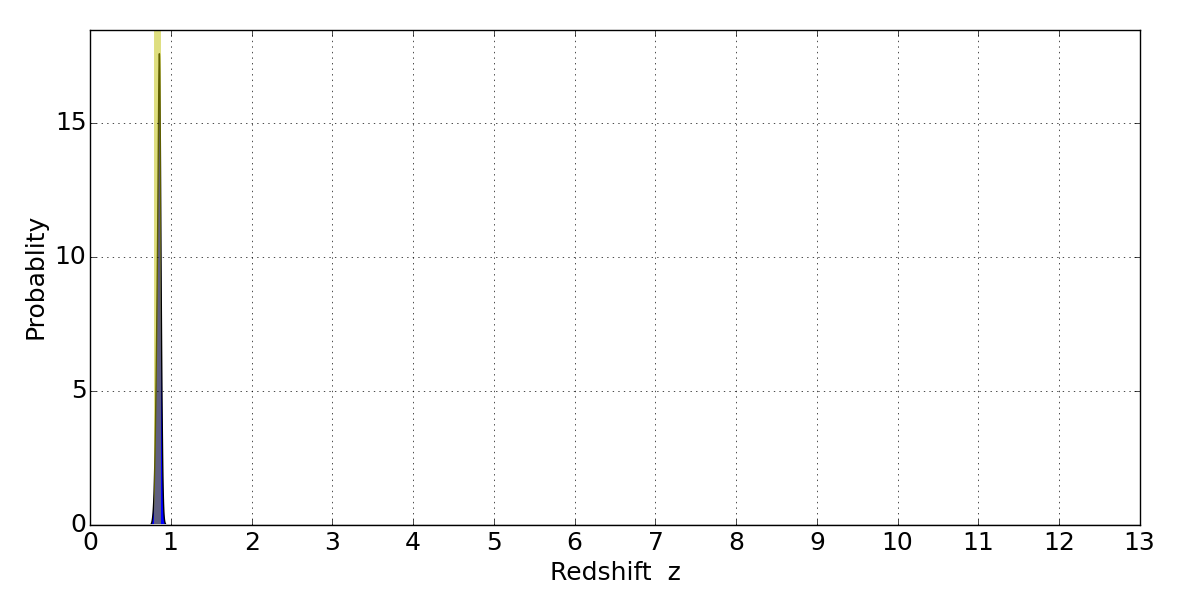 In P(z) plots: Yellow lines mark the cluster redshift z = 0.833,