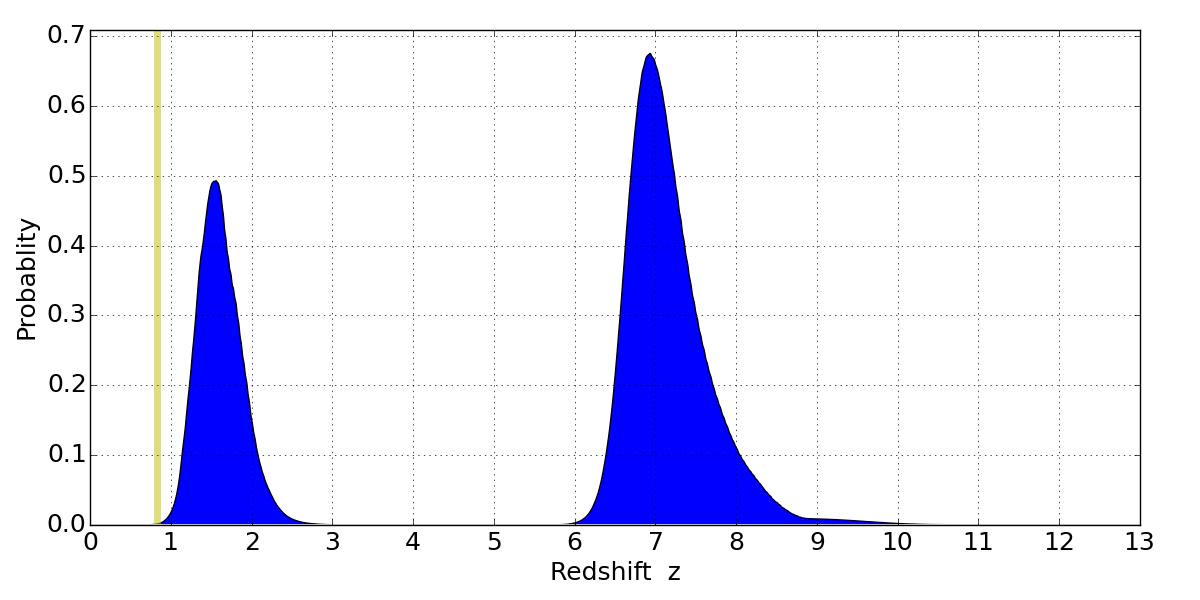 In P(z) plots: Yellow lines mark the cluster redshift z = 0.833,