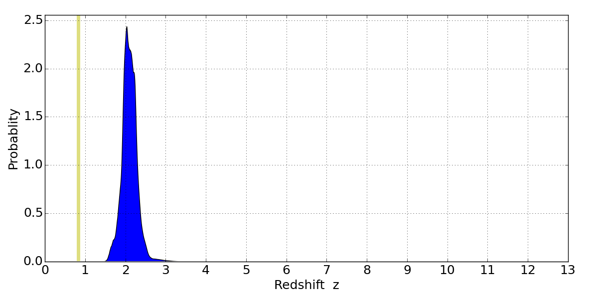 In P(z) plots: Yellow lines mark the cluster redshift z = 0.833,
