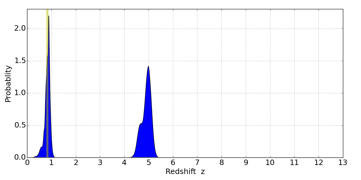 In P(z) plots: Yellow lines mark the cluster redshift z = 0.833,