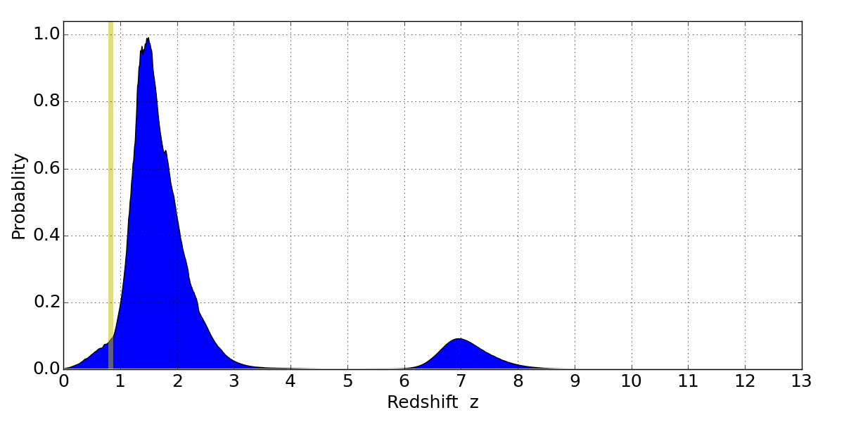 In P(z) plots: Yellow lines mark the cluster redshift z = 0.833,