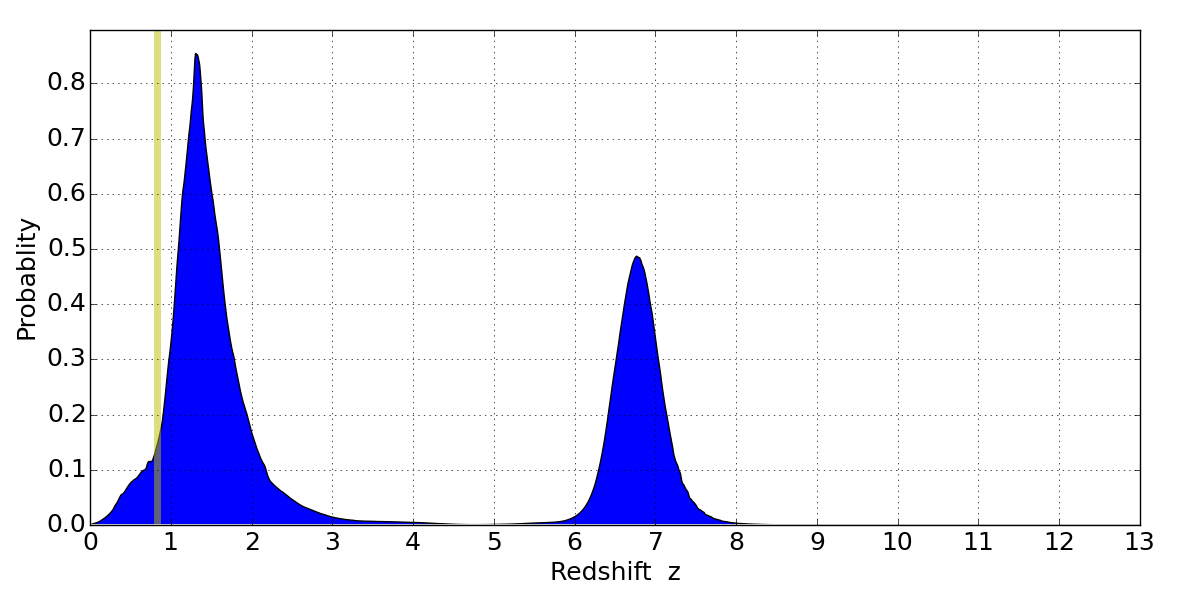 In P(z) plots: Yellow lines mark the cluster redshift z = 0.833,