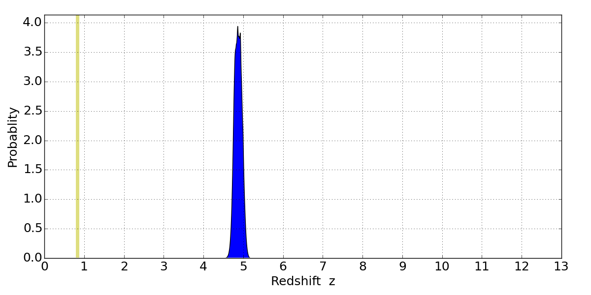In P(z) plots: Yellow lines mark the cluster redshift z = 0.833,
