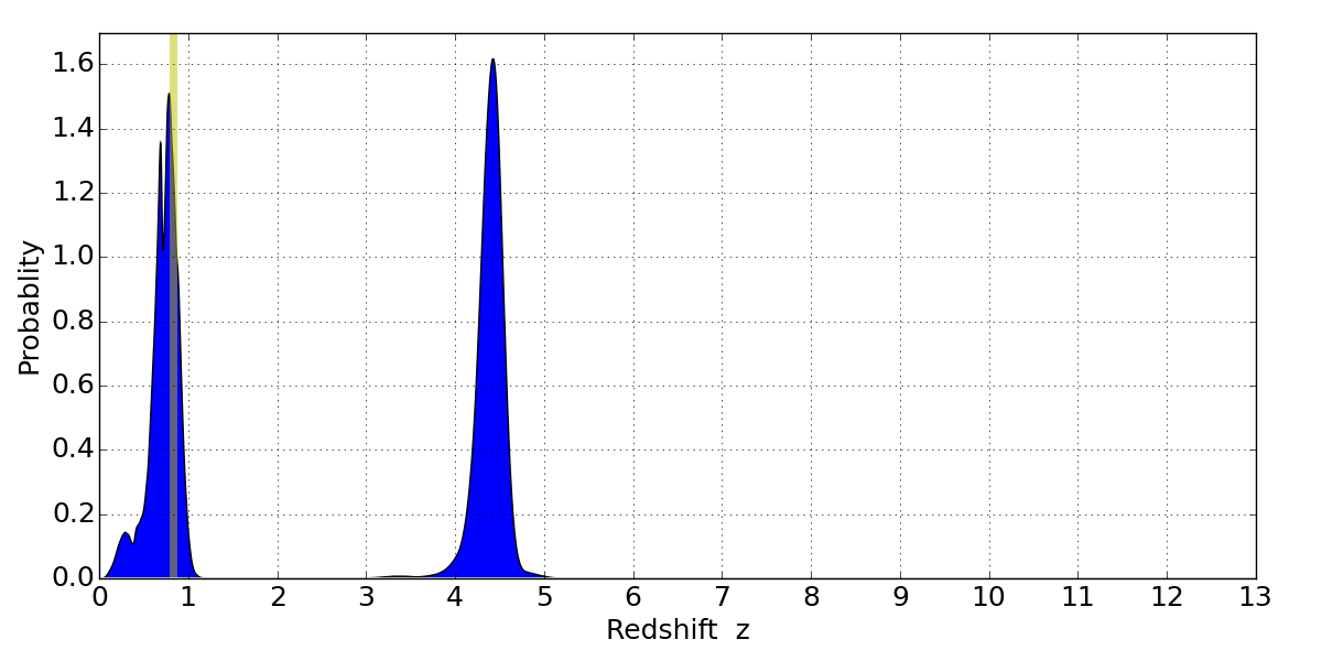 In P(z) plots: Yellow lines mark the cluster redshift z = 0.833,