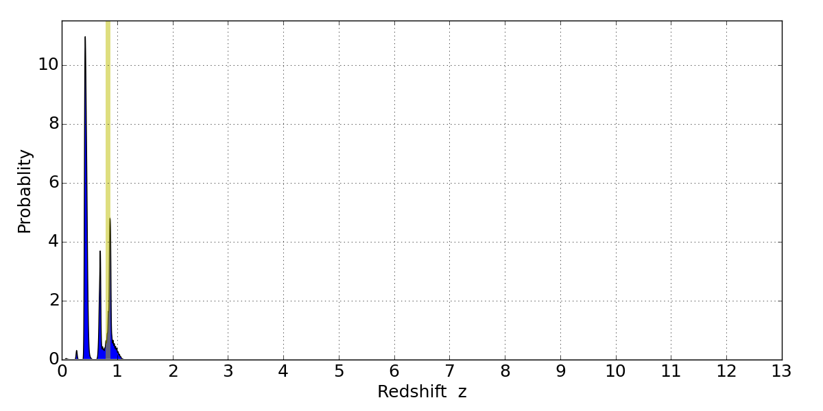 In P(z) plots: Yellow lines mark the cluster redshift z = 0.833,