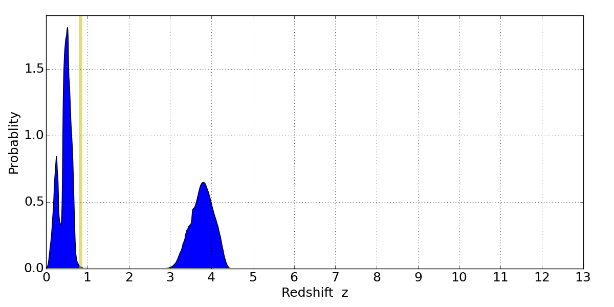 In P(z) plots: Yellow lines mark the cluster redshift z = 0.833,