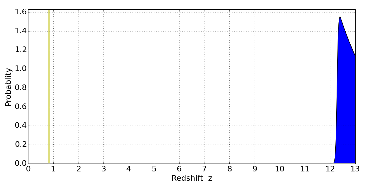 In P(z) plots: Yellow lines mark the cluster redshift z = 0.833,