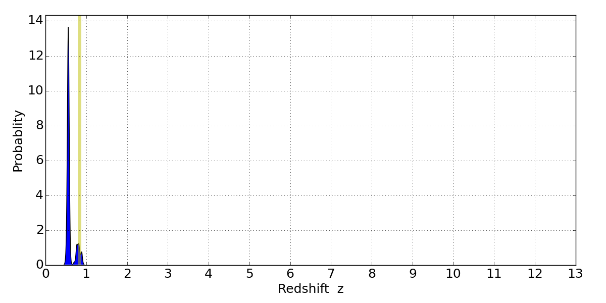 In P(z) plots: Yellow lines mark the cluster redshift z = 0.833,