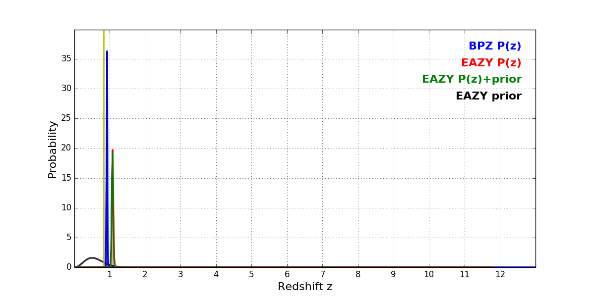 In P(z) plots: Yellow lines mark the cluster redshift z = 0.833,