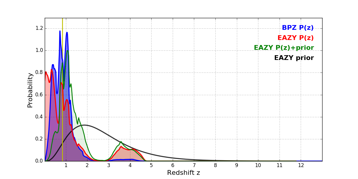 In P(z) plots: Yellow lines mark the cluster redshift z = 0.833,