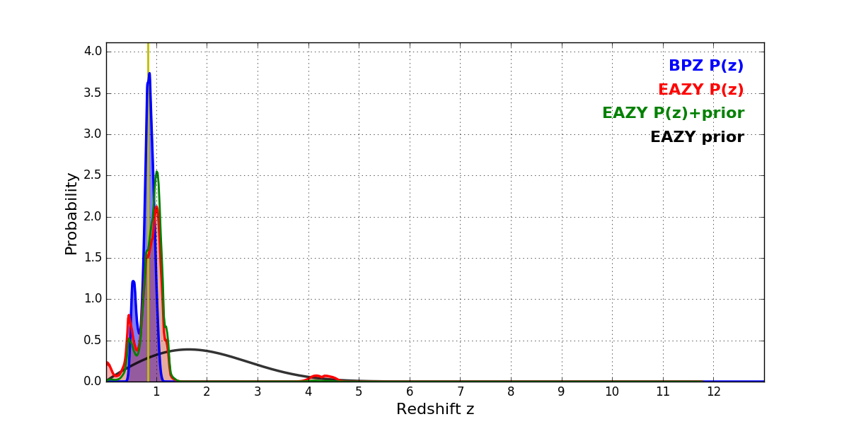 In P(z) plots: Yellow lines mark the cluster redshift z = 0.833,