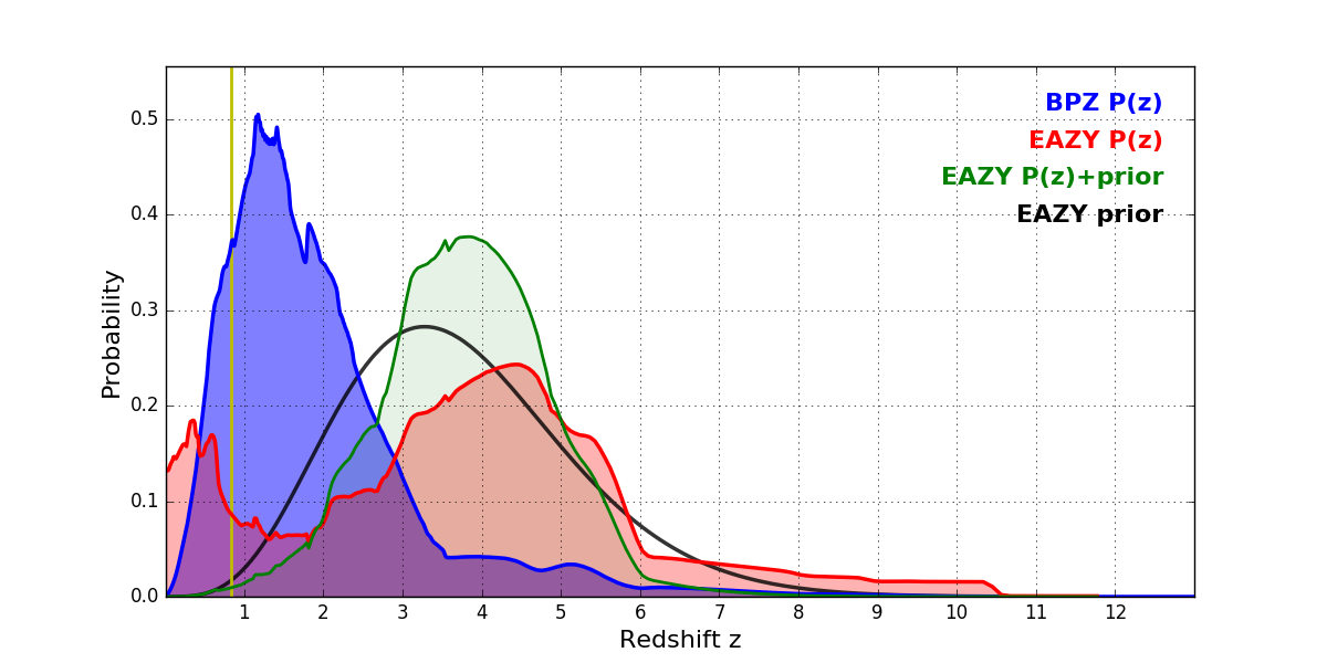 In P(z) plots: Yellow lines mark the cluster redshift z = 0.833,