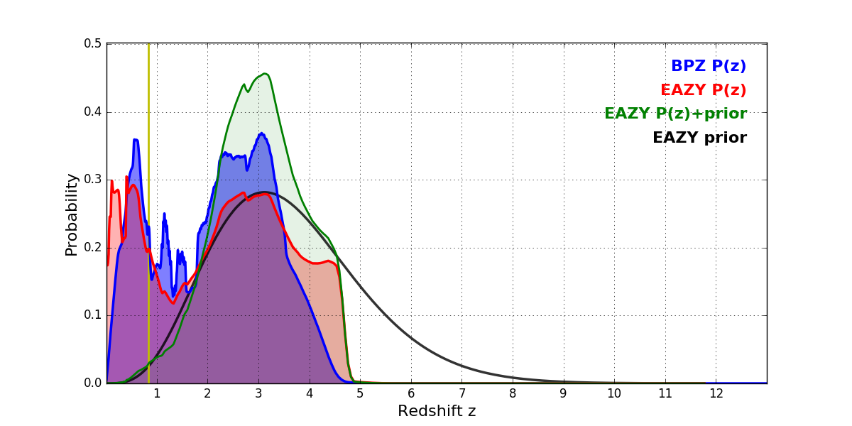 In P(z) plots: Yellow lines mark the cluster redshift z = 0.833,