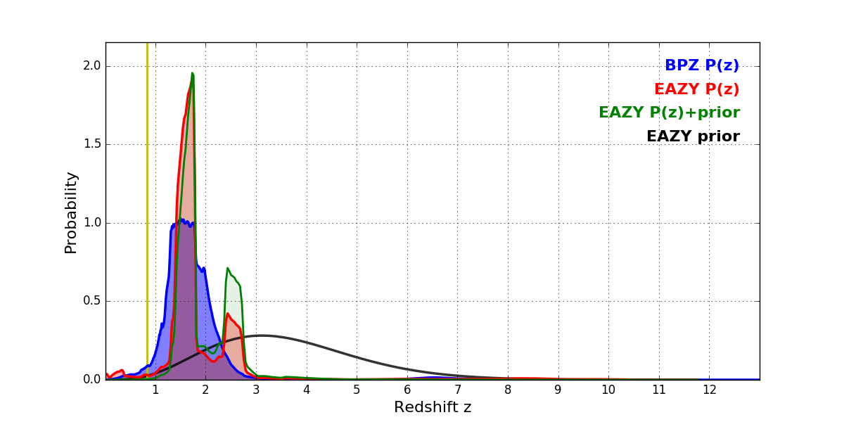 In P(z) plots: Yellow lines mark the cluster redshift z = 0.833,