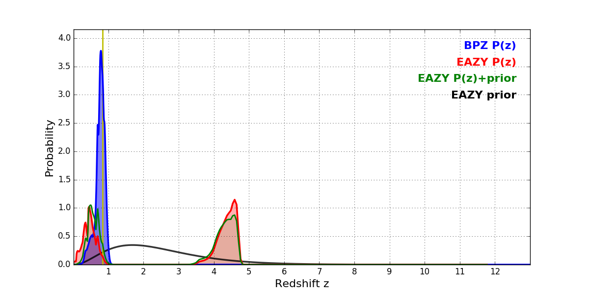 In P(z) plots: Yellow lines mark the cluster redshift z = 0.833,