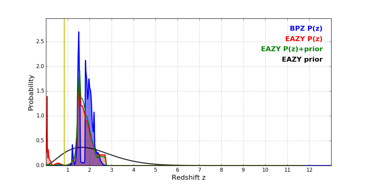 In P(z) plots: Yellow lines mark the cluster redshift z = 0.833,