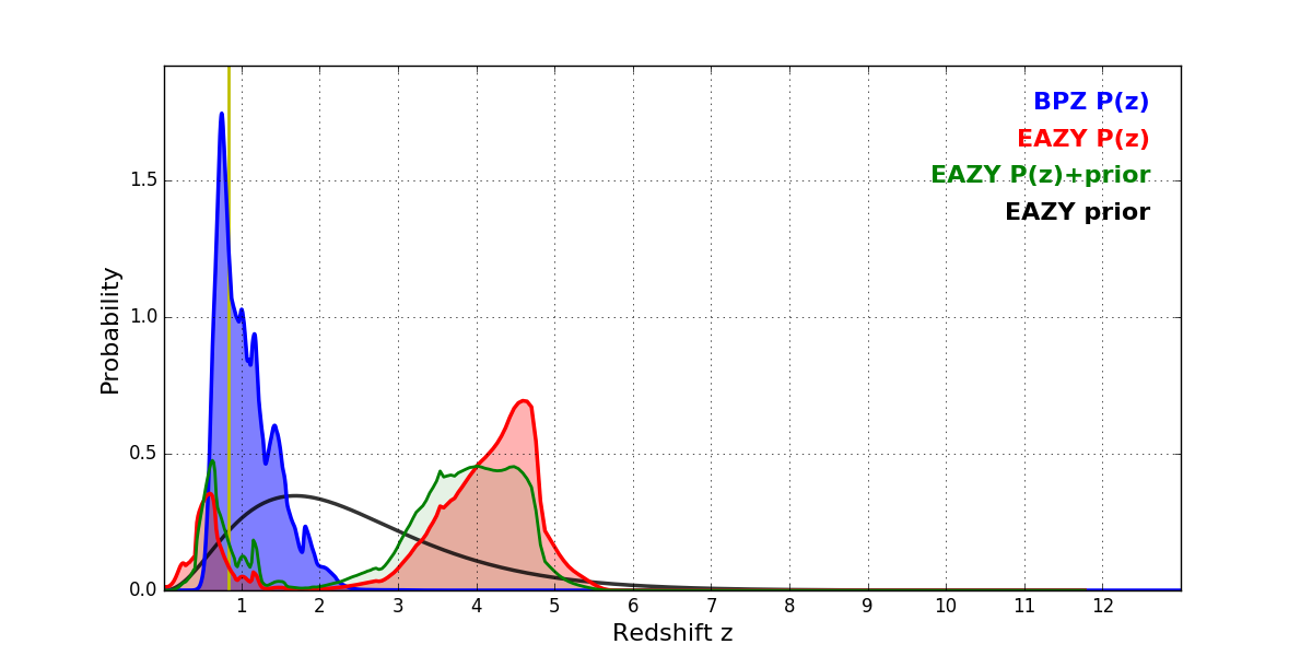 In P(z) plots: Yellow lines mark the cluster redshift z = 0.833,