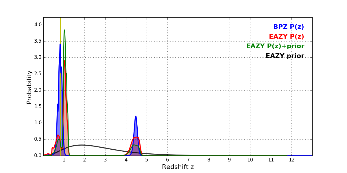 In P(z) plots: Yellow lines mark the cluster redshift z = 0.833,