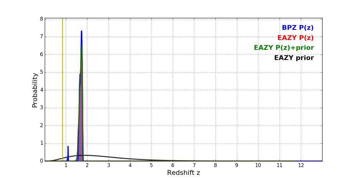 In P(z) plots: Yellow lines mark the cluster redshift z = 0.833,