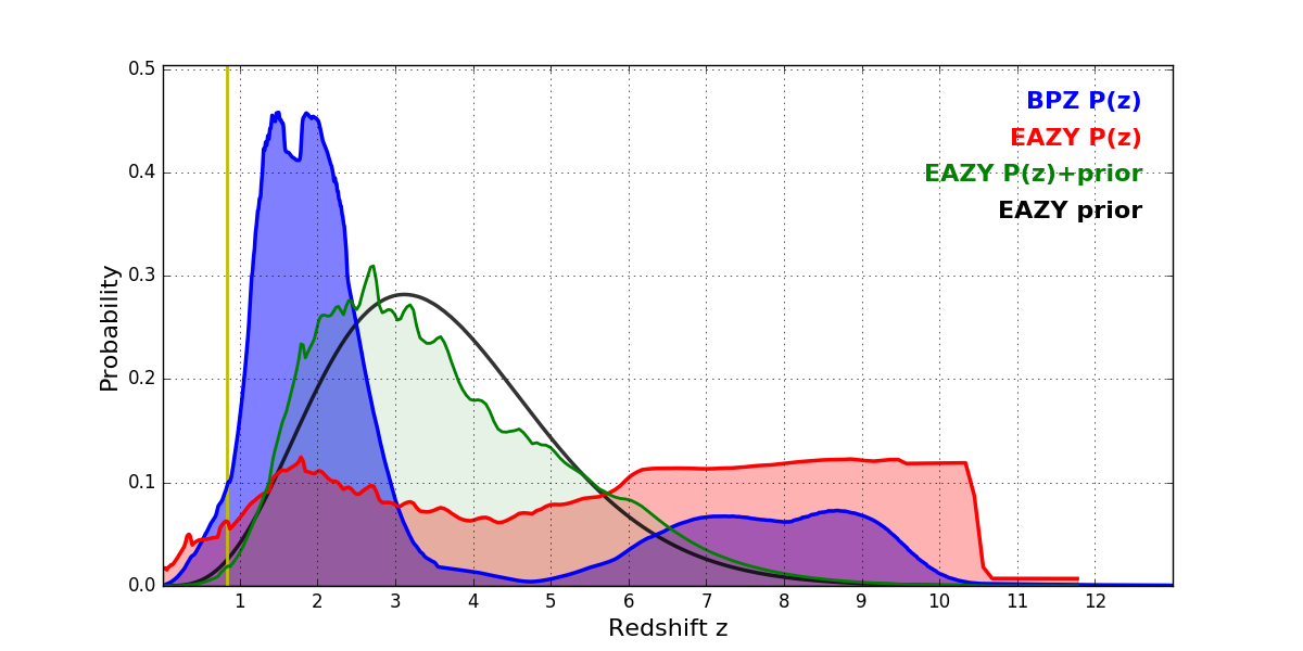 In P(z) plots: Yellow lines mark the cluster redshift z = 0.833,