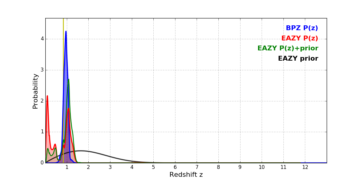 In P(z) plots: Yellow lines mark the cluster redshift z = 0.833,