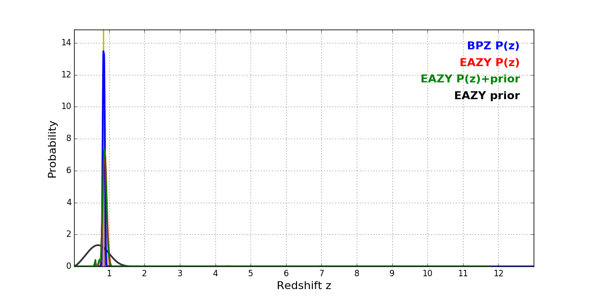 In P(z) plots: Yellow lines mark the cluster redshift z = 0.833,