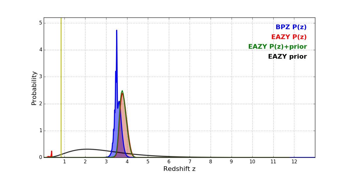 In P(z) plots: Yellow lines mark the cluster redshift z = 0.833,