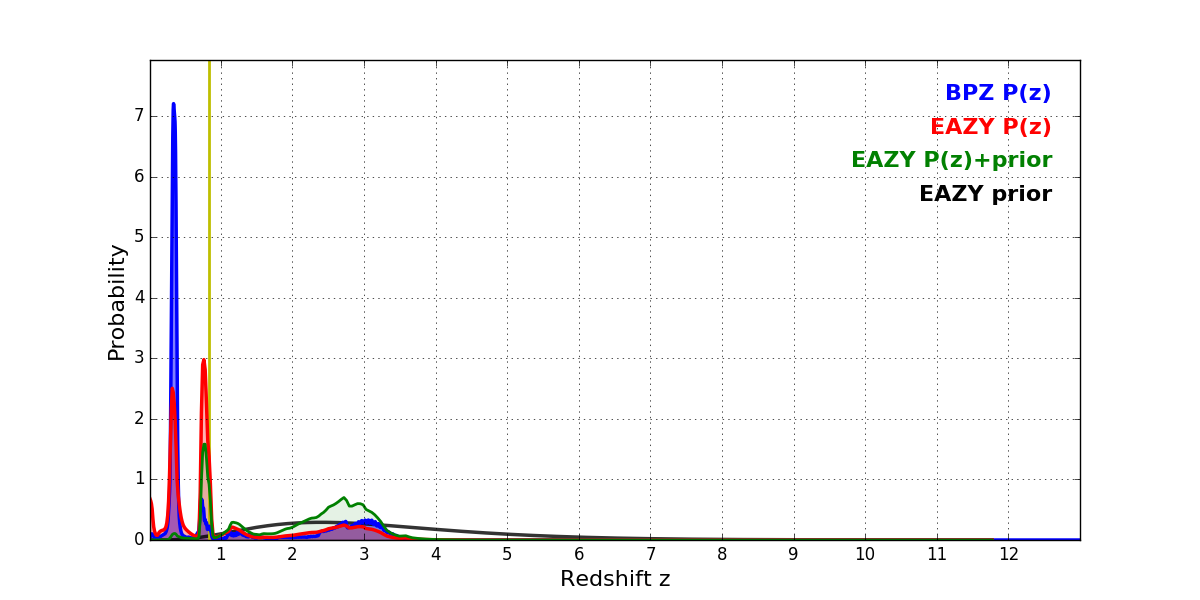 In P(z) plots: Yellow lines mark the cluster redshift z = 0.833,