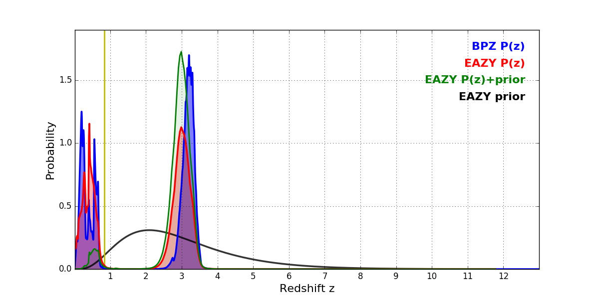 In P(z) plots: Yellow lines mark the cluster redshift z = 0.833,