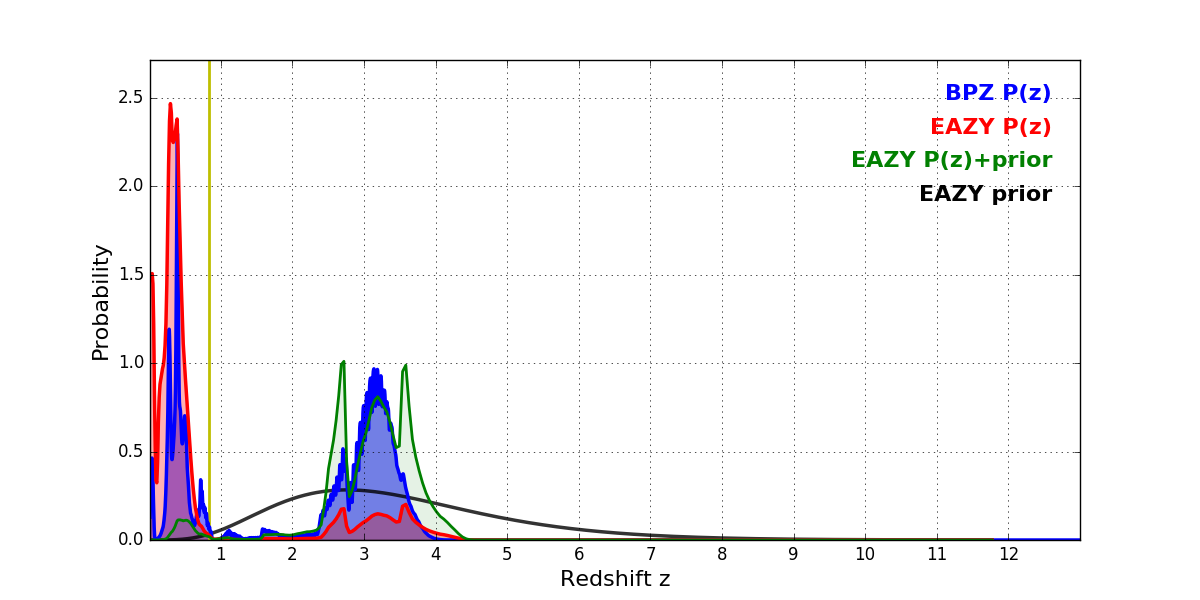 In P(z) plots: Yellow lines mark the cluster redshift z = 0.833,