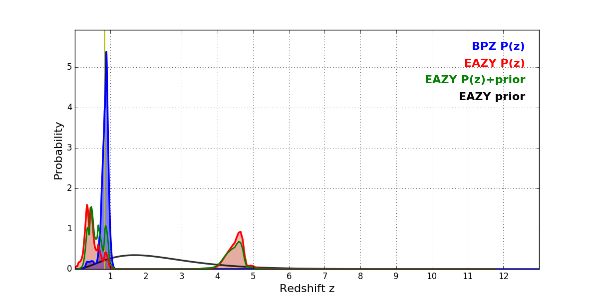 In P(z) plots: Yellow lines mark the cluster redshift z = 0.833,