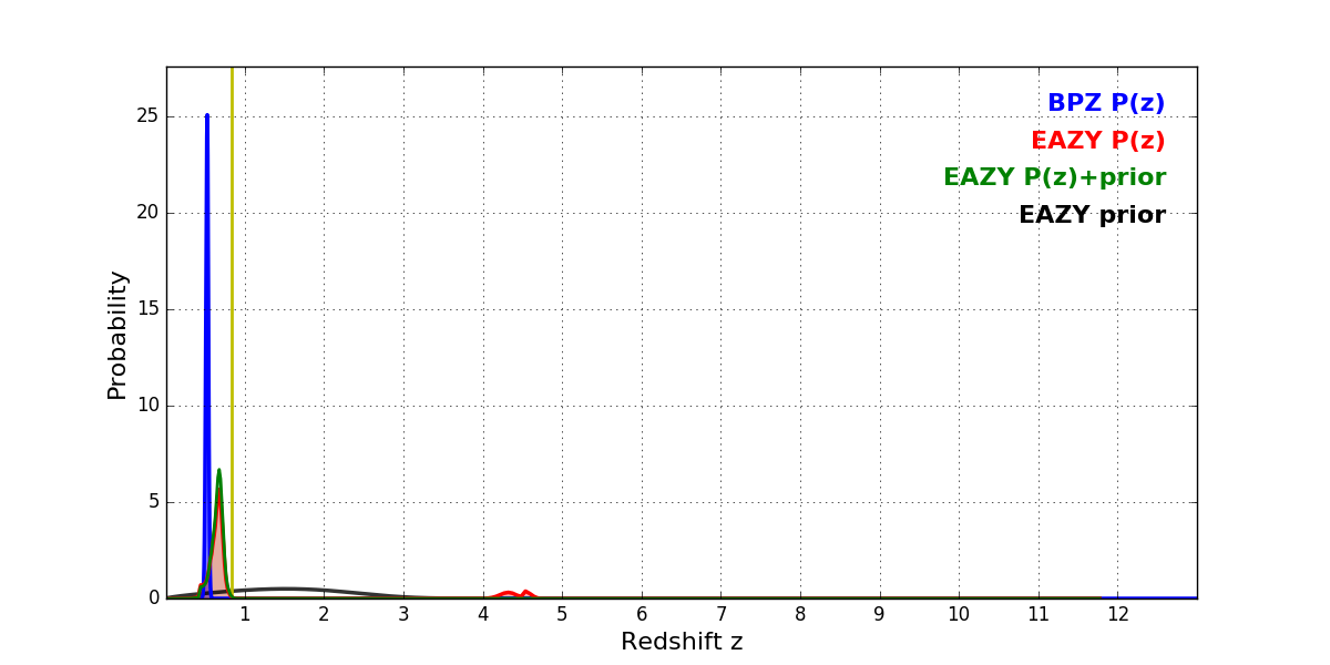 In P(z) plots: Yellow lines mark the cluster redshift z = 0.833,