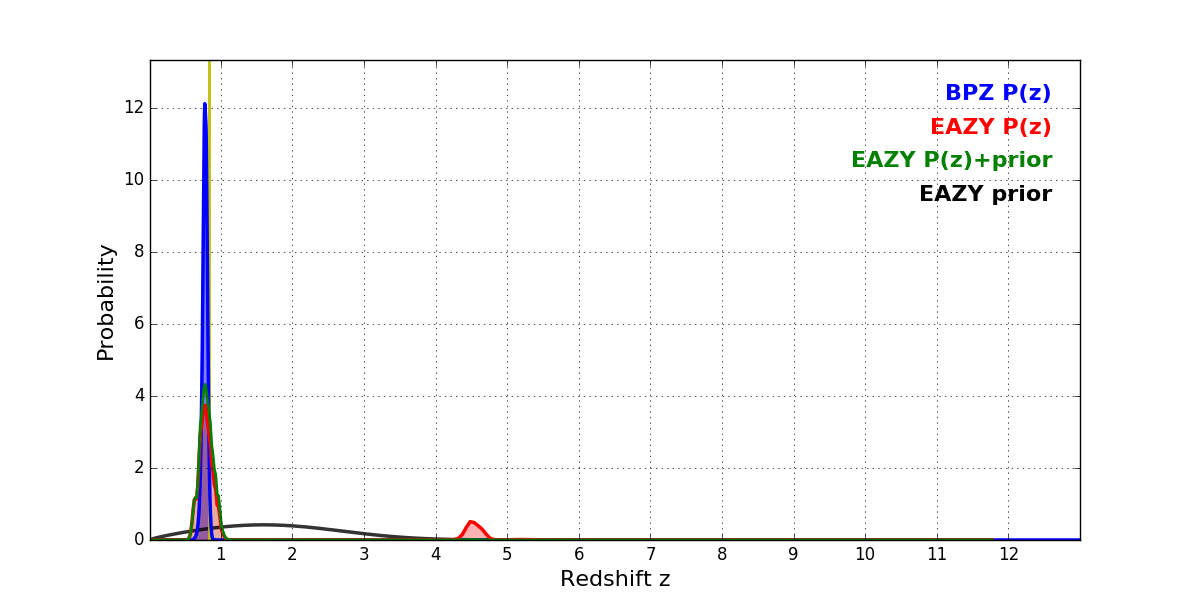 In P(z) plots: Yellow lines mark the cluster redshift z = 0.833,
