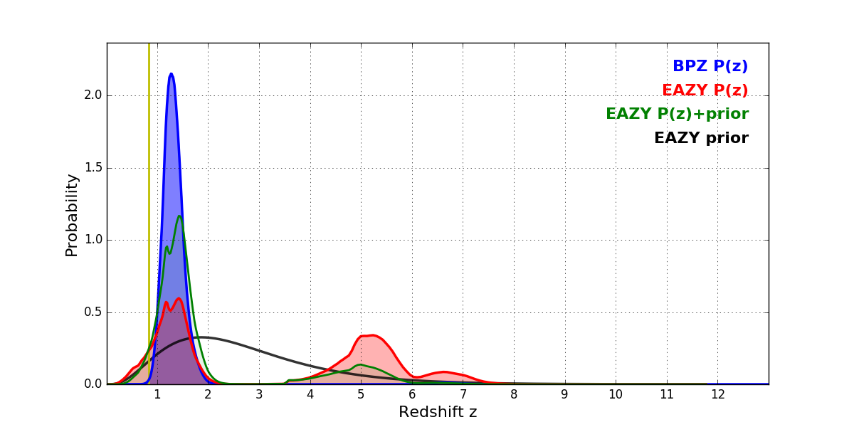 In P(z) plots: Yellow lines mark the cluster redshift z = 0.833,