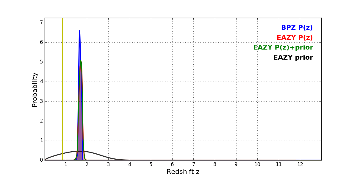 In P(z) plots: Yellow lines mark the cluster redshift z = 0.833,