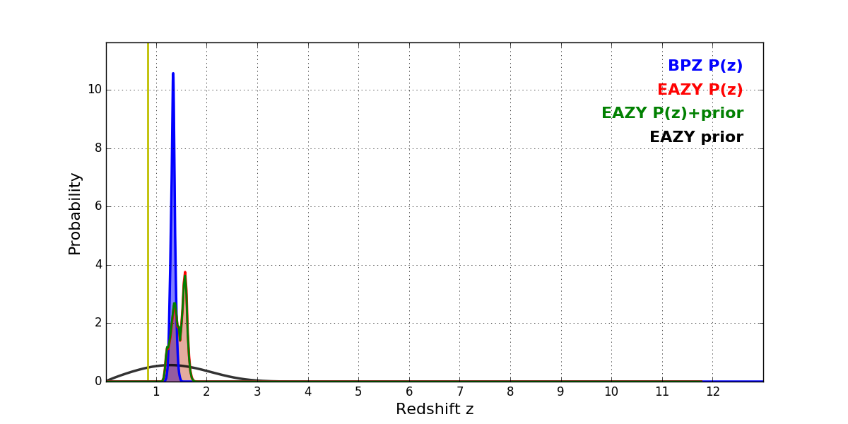 In P(z) plots: Yellow lines mark the cluster redshift z = 0.833,