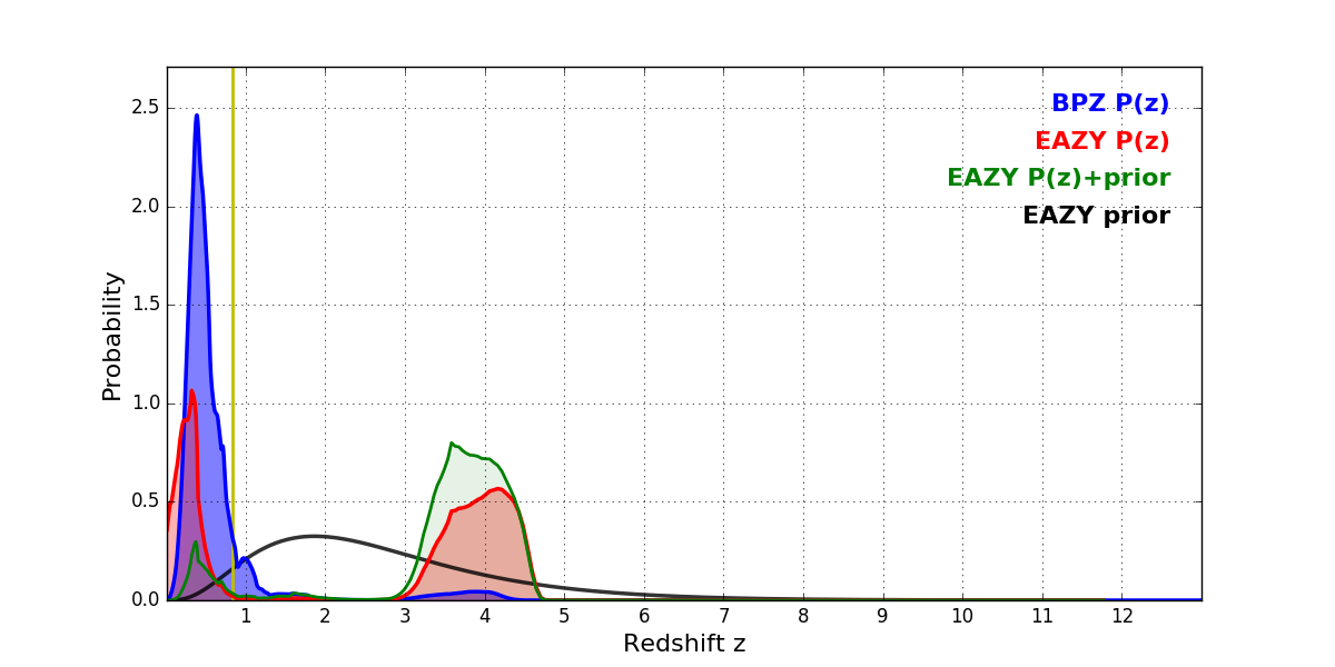 In P(z) plots: Yellow lines mark the cluster redshift z = 0.833,