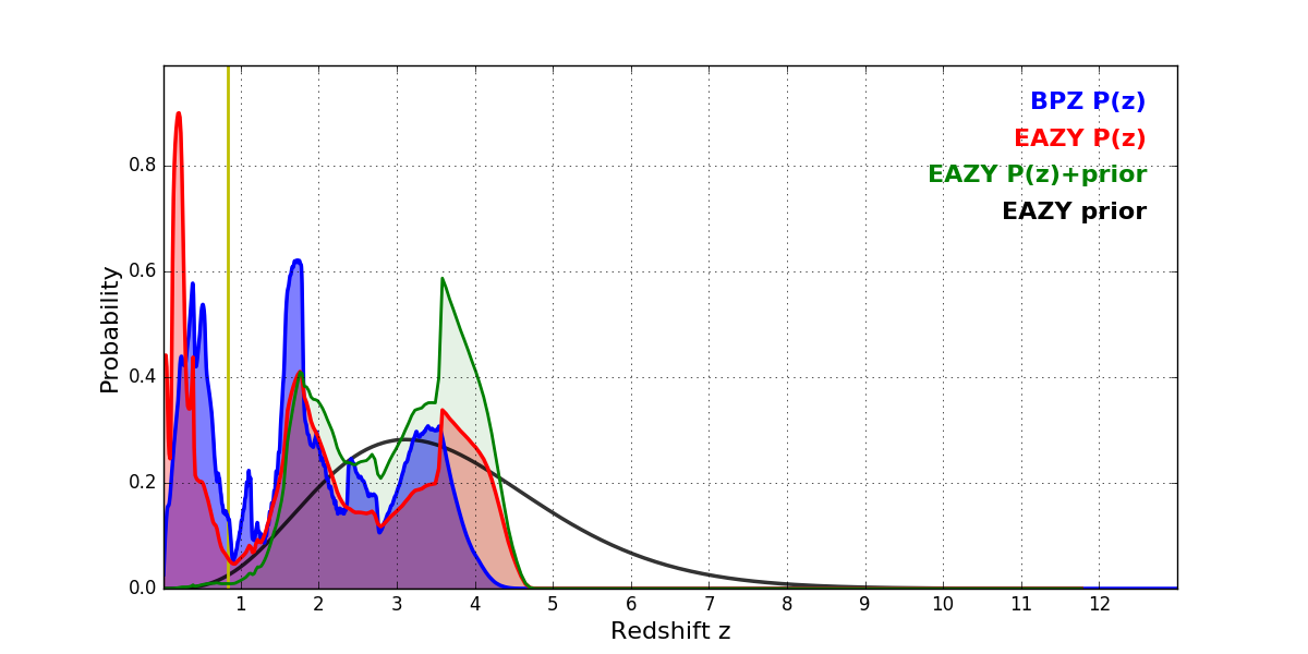 In P(z) plots: Yellow lines mark the cluster redshift z = 0.833,
