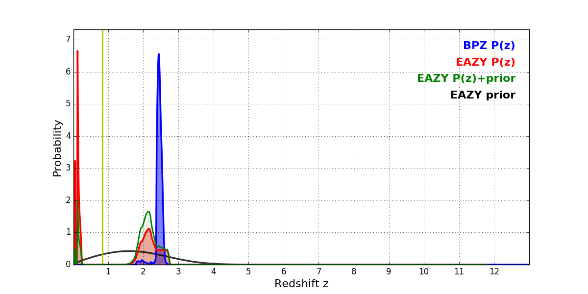 In P(z) plots: Yellow lines mark the cluster redshift z = 0.833,