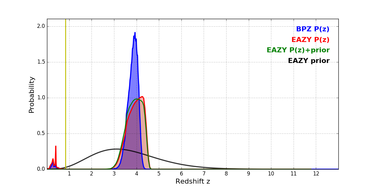 In P(z) plots: Yellow lines mark the cluster redshift z = 0.833,