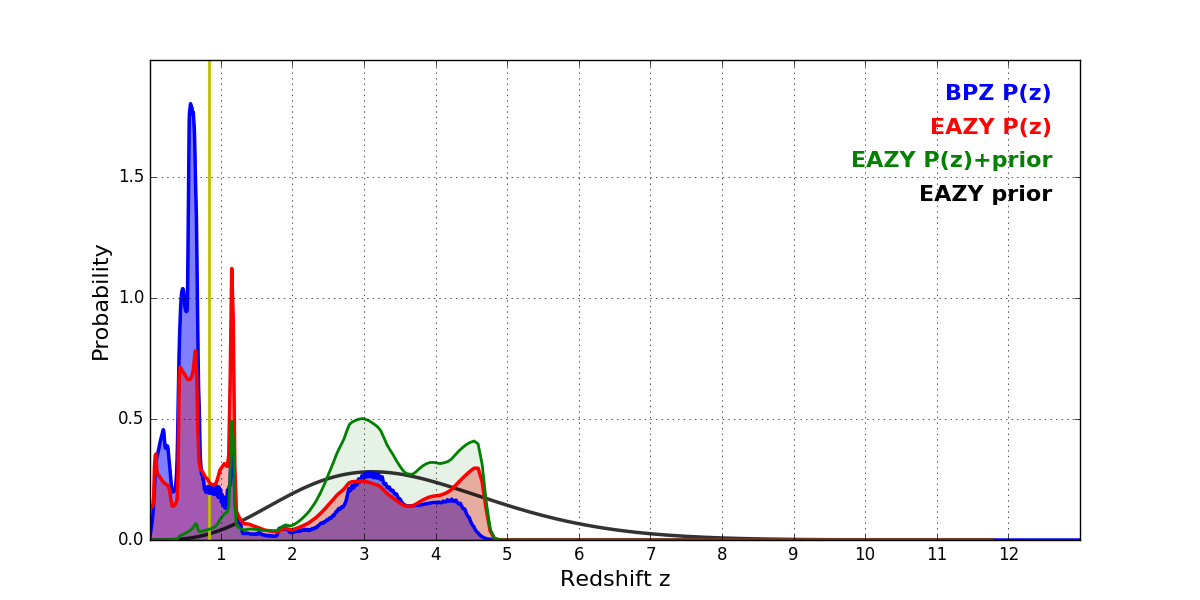 In P(z) plots: Yellow lines mark the cluster redshift z = 0.833,