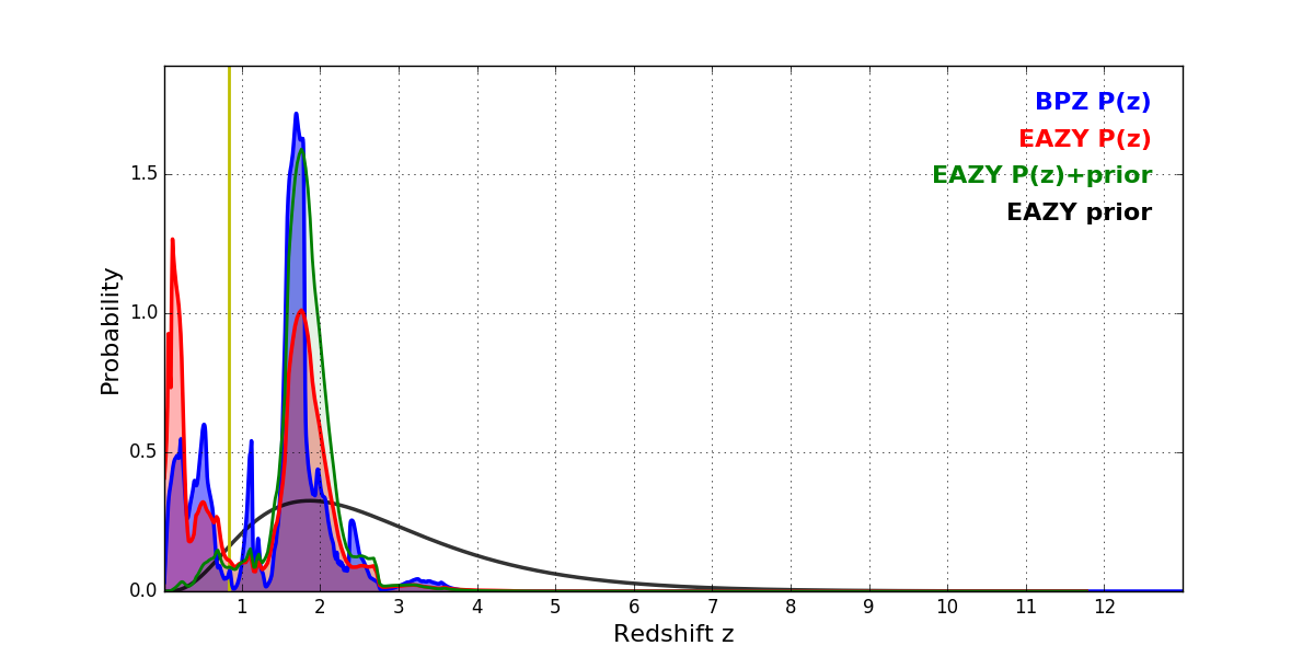 In P(z) plots: Yellow lines mark the cluster redshift z = 0.833,