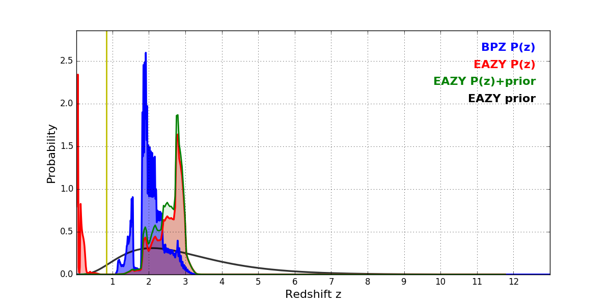 In P(z) plots: Yellow lines mark the cluster redshift z = 0.833,
